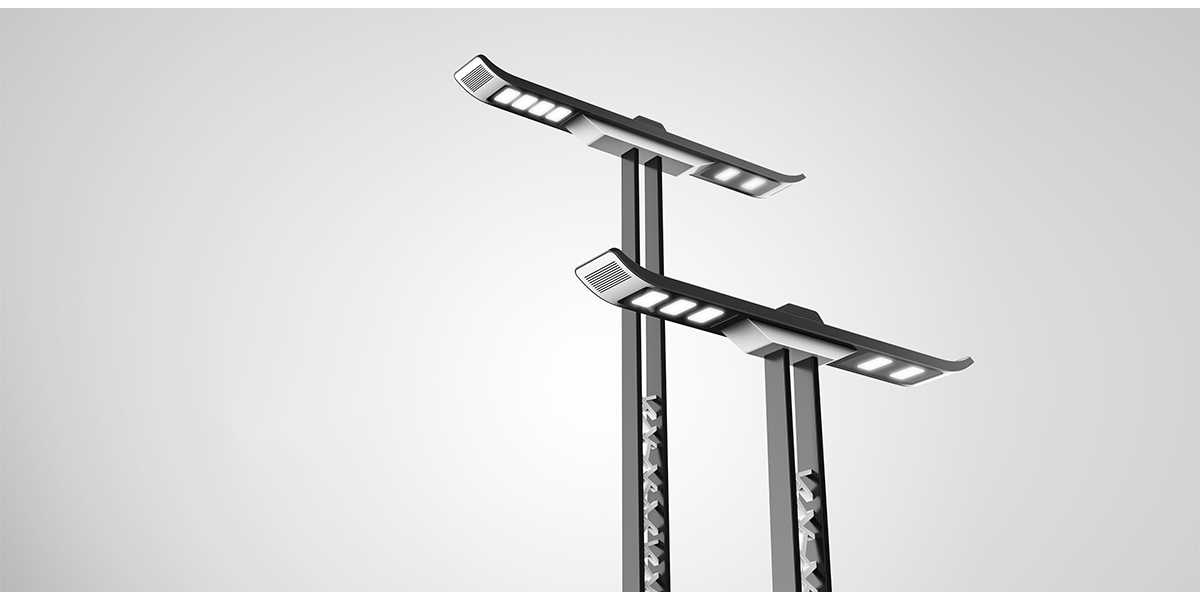 江南煙雨智慧路燈以江南獨特的建筑風格來展現(xiàn),應用白墻黑瓦的色彩,將烏黑的瓦房上翹元素運用至路燈的照明位置,加以花窗式錯落有致的紋理樣式讓此款路燈更具江南風,營造了獨特的韻味的同時可降低風阻。