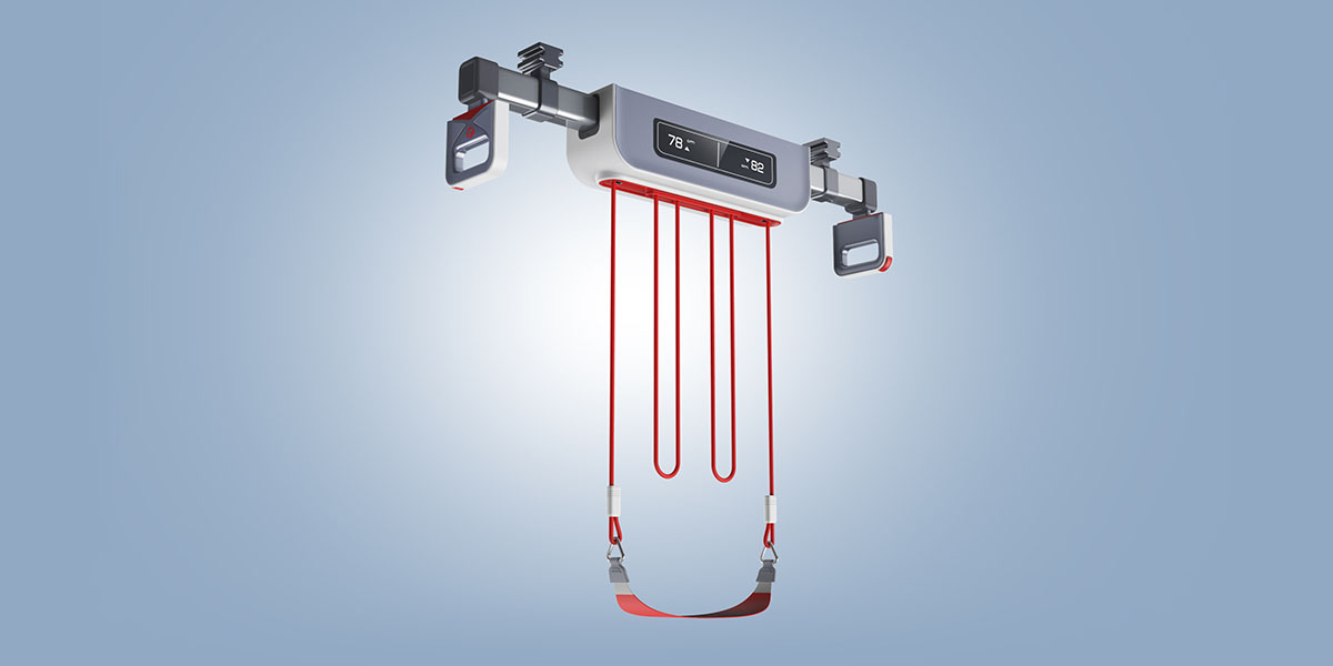 紅繩”康復理療終端是一款集康復醫(yī)療和運動健身一體的設備。設計團隊將移動模組和醫(yī)療床進行有機組合,打造了一體化的外觀設計形象。設計師給頂部配備了4套可安裝的模組,這樣可以保證覆蓋各種體重和身高的健復人員。